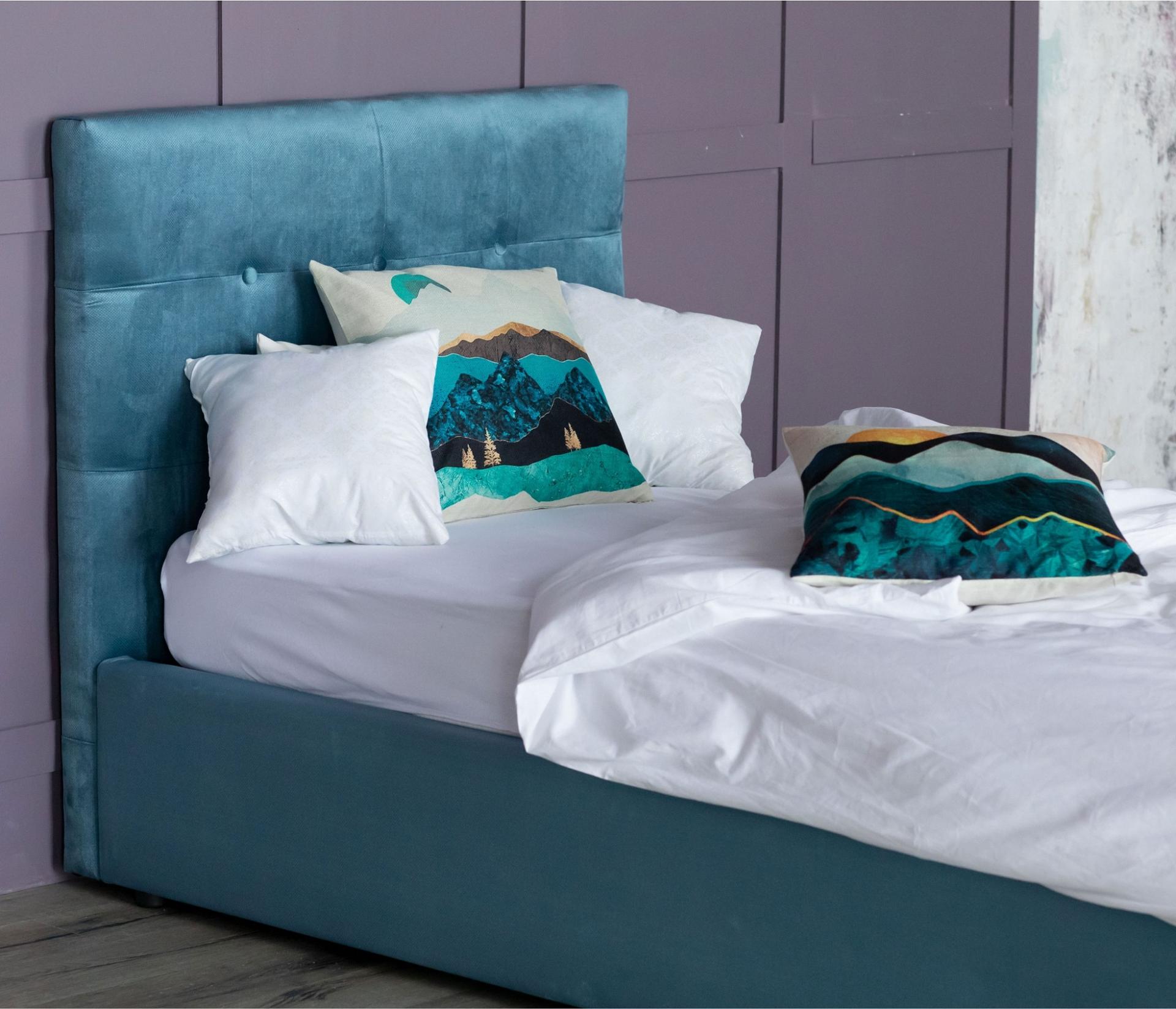 Спинка кровати мягкая, рельефная с неглубокими стяжками и декоративными пуговицами. Обивка изголовья и периметра кровати выполнена из велюра. Задняя стенка обшита спанбондом.