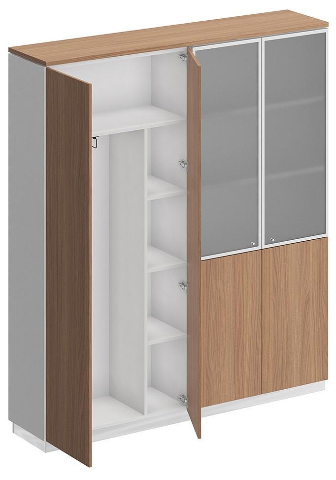 Шкаф состоит из шкафа для документов со стеклом и шкафа для одежды с дополнением под общим топом, цоколя на 2 шкафа и дверей.
