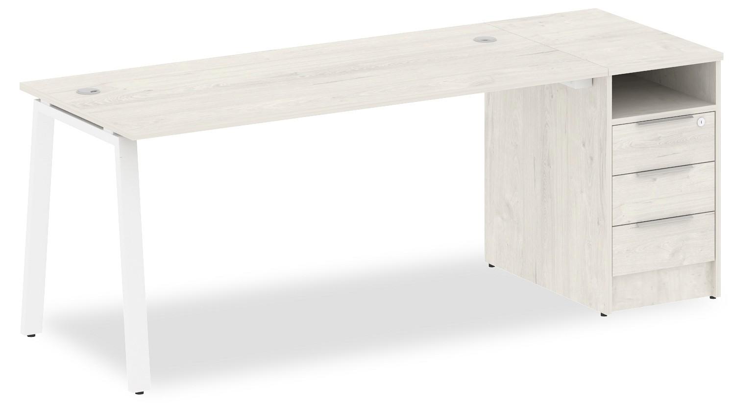 • 3 ящика. Для изготовления корпуса был выбран ЛДСП Е1, металл в оттенке белый, дуб наварра, завершает дизайн матовый верхний слой, гармонично перекликающийся со столешницей. Приобрести данную модель вы можете по привлекательной цене, равной 23156 руб.