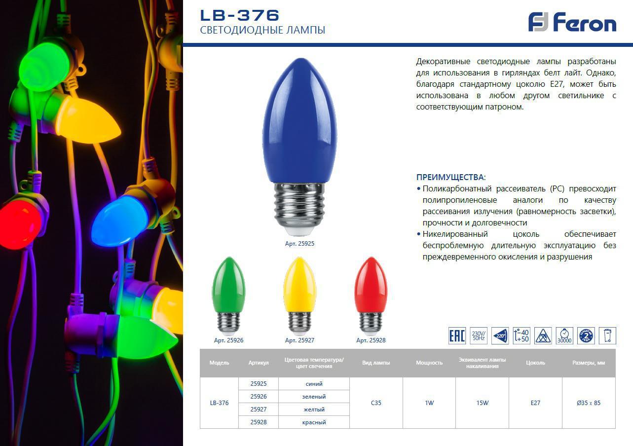 Лампа светодиодная Feron LB-376 свеча E27 1W зеленый