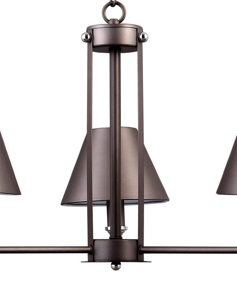 БАЙС. Основа люстры и плафонов - металл серого цвета с фактурной поверхностью. Геометрическая строгость в каждой детали. Центр люстры-металлические пластины, собранные в каркас, удерживающие лопасти основания. На лопастях уверенно расположились плафоны конусовидной формы.