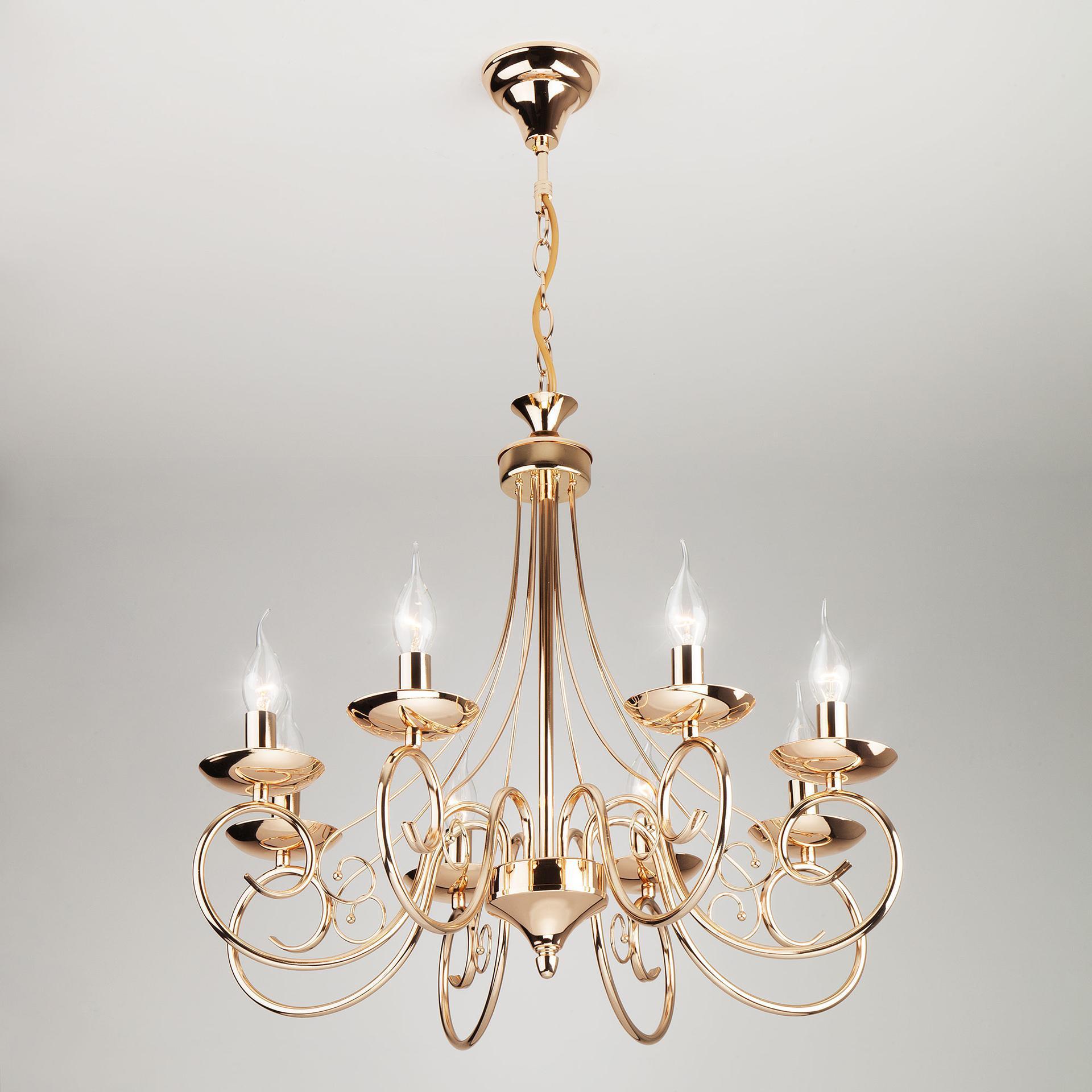 Классическая люстра с хрусталем на 8 рожков в цвете золото преобразит потолочное пространство и создаст в вашем помещении комфортное полноценное освещение на площади 38 м кв. Изящные формы и классический стиль добавят вашей гостиной утонченного аристократизма. Декоративные рожки в виде подсвечников, украшенные сменными лампами с цоколем E14 типа "свеча на ветру" переливаются на свету яркими завораживающими бликами. В производстве подвесной люстры использовали высококачественный металл с надежным защитным покрытием. В нашем интернет-магазине вы можете купить подвесную люстру по выгодной цене с доставкой по Москве и России.