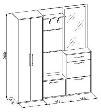 Вместительная модульная стенка для прихожей, состоящая из двух тумб для обуви, вешалки, зеркальной панели и платяного шкафа.